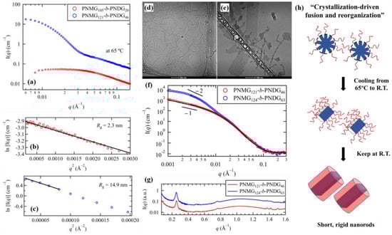 Time/temperature-dependent synchrotron X-ray/neutron scattering experiments were performed to further investigate the self-assembly pathway and formation mechanism of these 1D nanofibrils. High-temperature solution SAXS result shows that the PNMG105-b-PNDG20 polymers are well-dissolved and exist as unimers in methanol at 65 °C (Figure 6a,b), which gives a radius of gyration (Rg) of 2.3 nm by Guinier plot analysis. Upon cooling the solution to room temperature, a drastic change of the scattering profile was observed (Figure 5i). At time t = 0 min, i.e., immediately after the solution was cooled down from 65°C to room temperature, the SAXS profile shows a noticeable upturn at the low q region, while the overall intensity is still relatively weak. Such intensity upturn with a q−2.5 dependence is attributed to the formation of polymer aggregates, i.e., the “seeds”, at the very early stage after the solution was cooled down to room temperature. With increasing of time, (001), (100) and their higher order reflections started to appear after ~100 min and intensify over time. Meanwhile, at the low q regime in SAXS spectra, the dependence of intensity over q gradually changed over from I ~ q−2.5 to q−1.5, and eventually to q−1 after ~400 min, while the overall absolute SAXS intensity continue to increase until a final state was reached. We attribute this increase in the SAXS intensity mainly due to the one-dimensional elongation of the nanofibrils, consistent with the time-dependent cryo-TEM results shown in Figure 5a–c. Note that the SAXS profile of the final PNMG105-b-PNDG20 nanofibrils at t = 15 days can be well-fitted by using the scattering model for core-corona cylindrical micelles developed by Pedersen and co-workers [,], which gives a core radius (Rc) of 3.3 ± 0.2 nm and a radius of gyration of the corona chains of 3.8 ± 0.2 nm. The average diameter of the nanofibrils is then estimated to be approximately 23.4 nm, in good agreement with the cryo-TEM result.