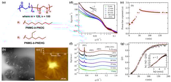 (a) The chemical structures of PNMG-b-PNOG and PNMG-b-PNEHG used for comparison purpose. (b) Cryo-TEM and (c) AFM images for PNMG116-b-PNOG94 in a diluted methanol solution. (d) Representative SAXS profiles of the 5 mg/mL PNMG116-b-PNOG94 methanol solution at different waiting times (t) after being cooled down to room temperature. (e) Plot of the exponent (a) values of I(q) ~ q−a near q = 0.006 Å−1 as a function of t. (f) The corresponding WAXS profiles at different t, where the data have been shifted vertically for clarity. (g) The ζ(t) values (black circles) obtained from the normalized integrated intensity of the (001) peak at different t. Inset of (g) shows the corresponding Sharp–Hancock plot. The red solid lines in (g) correspond to the best-fits to the data using the Avrami–Erofeev expression, ζ(t) = 1–exp[–(kt)n], with n = 2. Figure reproduced from reference [] with permission from the American Chemical Society.