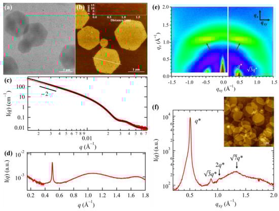 (a) Cryo-TEM and (b) AFM images for PNMG121-b-PNEHG101 in diluted methanol solution. (c) SAXS and (d) WAXS intensity profiles for the 5 mg/mL PNMG121-b-PNEHG101 in methanol. The solid line in (c) corresponds to the best-fit to the data based on the scattering form factor for disk-shaped polymer micelles. (e) Two-dimensional GIWAXD image for the PNMG121-b-PNEHG101 hexagonal nanosheets deposited onto a Si substrate. The two off-axis streaks are indicated by red arrows in (e). (f) One-dimensional GIWAXD profile along the qxy (in-plane) direction. The corresponding AFM image for the GIWAXD sample is shown in the inset of (f). Figure reproduced from reference [] with permission from the American Chemical Society.