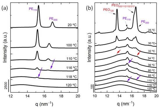 Continuing with Figure 7b, the first reflection at 103 °C ((110) reflection at 15.4 nm−1) corresponds to the PE block, along with the (200) reflection (16.9 nm−1) at 100 °C (see violet arrows). The second block to crystallize in this diblock copolymer at 39 °C is the PEO block (red arrows), identified due to the presence of the (120) reflection at 13.8 nm−1 and ((032)/(112)/(132)/(212) reflections at 16.4 nm−1. Once again, normalized intensities in Figure 8b confirm the temperature ranges at which both the PE and the PEO blocks start to crystallize due to the sharp increase in the intensity of the corresponding peaks.