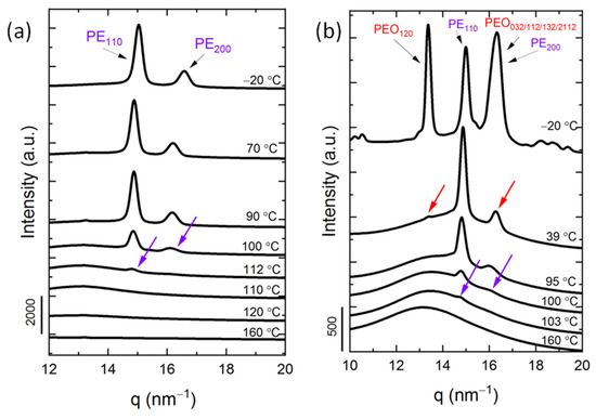 In this case, Figure 7a shows that the crystallization of the homopolymer PE9.5 starts at 112 °C (PE110 at 15.4 nm−1), and the second scattering peak appears at 100 °C, PE200 (16.9 nm−1) (see violet arrows). Figure 8a shows the broad temperature range at which PE crystallizes since a plateau is not reached until approximately 60 °C, determining this way that PE crystallizes in between 112 and 60 °C.