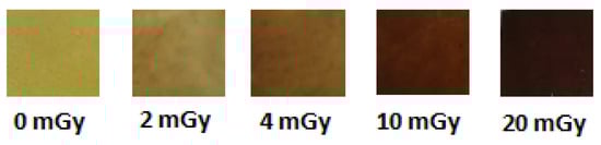 Direct perceived color change of PVA/Ag+/NBT films irradiated with different X-ray doses.