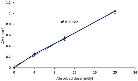 Dose–response curve based on UV-Vis absorption capacities at λmax for PVA/Ag+/NBT films exposed at various X-ray doses.