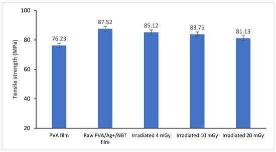 Figure 6 shows the variation of the tensile strength of the PVA film, as well as untreated and irradiated PVA/Ag+/NBT nanocomposite films. We noticed a relatively significant increase in tensile strength after the incorporation of NBT and Ag into the matrix of the nanocomposite film. Therefore, this confirmed the absence of phase separation on the doped film, thus indicating good compatibility between NBT, silver and PVA, which improved the tear-resistance of the made composite film. This phenomenon can be caused by the presence of hydrogen and coordination bonds which enhance the intermolecular forces between the NBT, the silver and the base PVA matrix and thus improve the tensile strength of the PVA blend film []. With increased X-ray doses, the tensile strength decreased slightly. This confirmed the reduction of the crystalline structure after irradiation (confirmed from XRD analysis). The decrease in mechanical properties suggests that irradiation induces structural rearrangement and probably the prevalence of intermolecular and chain scission processes.