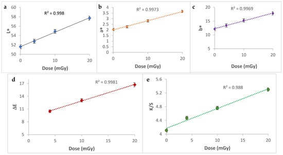 CIELab color parameters (L*, a* and b*) (a–c), total color difference (ΔE) (d) and color strength (K/S) (e) measurements for PVA/Ag+/NBT films irradiated from 4 to 20 mGy.
