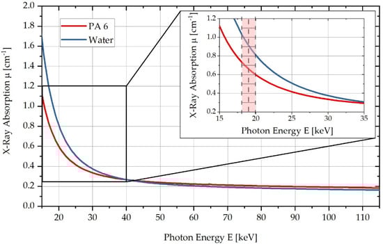 PA6 and water differ in their respective linear X-ray absorption coefficients as a function of energy. These energy-dependent absorption coefficients can be calculated using the photon cross-sections database, XCOM [27]. Figure 1 shows the respective curves of the linear X-ray absorption coefficient of the two substances as a function of the photon energy . Here, it can be seen that in the red-marked energy range below , a sufficiently large absorption difference exists to differentiate water and PA6 within this energy range in CT measurements. According to Figure 1, the X-ray absorption coefficient of PA6 increases by approx. at a maximum water absorption of .