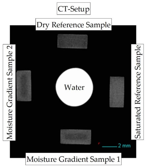 The sample arrangement of the measurement setup is shown in Figure 2. During each measurement, five sample positions within the measurement setup are used: two samples with different concentration distributions and varying integral water contents (gradient samples and ), which can be seen on the positions “bottom” and “left” in the measurement setup shown. In addition, two reference samples are required. A dry sample (position “top”), which is (vacuum) dried and has an initial moisture content of , and a completely water-saturated sample (position “right”) with a storage time of approx. in a water bath at room temperature and approx. at water bath temperature. Both reference samples are required in the reconstruction to determine the mean absorbance of dry and fully water-saturated material, respectively. In addition, a capillary with water is measured in the middle of the samples as a further reference.