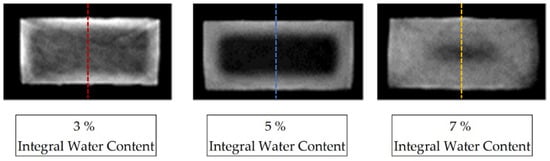 Figure 2 shows the reconstructed cross-section of three samples of the dimensions (4 × 2 × 80) mm3, selected from the center of the sample, aged for different periods in the water bath at room temperature as a greyscale image. The variation in the storage periods in water results in different integral water contents for the samples determined by mass increase, which are given as integer values.
