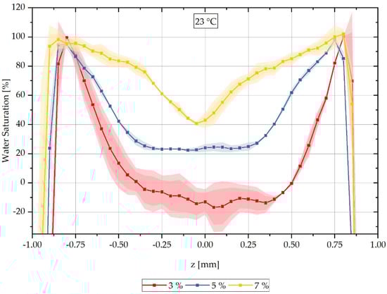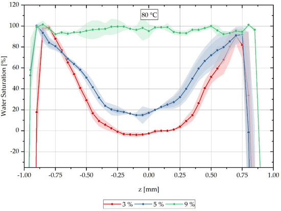 For each sample, a characteristic grey value distribution over the sample cross-section can be recognised, which is evaluated subsequently along the dotted lines inserted in the samples shown in Figure 3, and which correspond to the reconstruction method of the water concentration distribution described in Equation (3). The dotted lines in Figure 3 represent the z-direction in the sample coordinate system. Figure 4 shows the local water saturation along the samples’ z-direction for the integral water contents of 3% (red line), 5% (blue line) and 9% (green line) for the water bath temperature of 80 °C. The water bath temperature of 80 °C was initially chosen to be considerably above the glass transition range of approx. 60 °C of dry PA6.