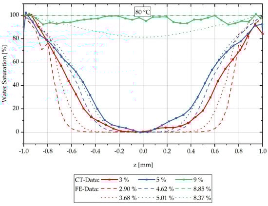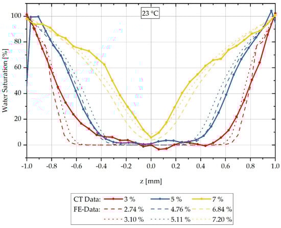 Furthermore, it can be seen that for the integral water content of 3% for both water bath temperatures, negative water saturations are also determined in the reconstruction. These negative values occur when a higher average X-ray absorption is measured for the completely dry reference sample than the simultaneously measured gradient sample has in its dry core as a locally determined absorption value . For this purpose, negative reconstruction values are shifted to the water saturation of 0% on the ordinate in the following, so that a comparison of the CT measurements with the FE calculations can be accomplished. The applied shift parameters are listed in Table 3 and used according to Equation (14). Here the value results from the multiplication of the shift factor with the original measured value and the subsequent addition of the factor .