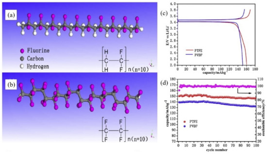 Chemical structures of (a) PVDF and (b) PTFE. (c) The first charge/discharge curves of PTFE and PVDF electrodes at 0.1C. (d) Cycle stability of cathodes prepared form PVDF and PTFE evaluated at 0.2C rate. Reprinted with permission from ref. [42]. Copyright 2015 Elsevier.