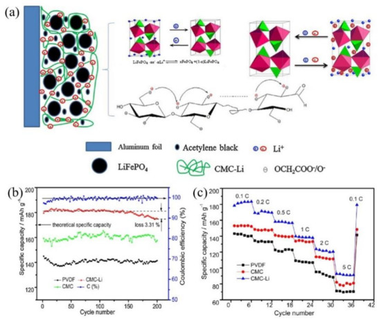 Preliminary investigation of the mechanism of the CMC-Li binder in LiFePO4 battery and charge/discharge tests. (a) Preliminary investigation of the mechanism; (b) Specific capacity; (c) Rate performance. Reprinted with permission from ref. [67]. Copyright 2014 Elsevier.