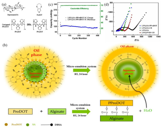 (a) Chemical structure of deprotonated SA, ProDOT, and PProDOT. (b) Schematic design of the microemulsion system for synthesis of SA-PProDOT polymer. (c) Long-term performance of LFP electrodes binder based on SA-PProDOT (LFP:binder = 8:2) binder. (d) EIS spectra of the LFP@SA-PProDOT, LFP@SA-CB, LFP@SA, and LFP@PVDF-CB samples between 0.1 Hz and 100 kHz. Reprinted with permission from ref. [78]. Copyright 2015 the American Chemical Society.