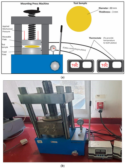 Mechanical compression setup was comprised of a CY-600D mounting press, made in China, connected with thermostats for controlled heating purposes. Epoxy composite samples were first heated at 700C and then compressed. The compression experiment was carried out with five constant increasing interval mechanical pressure steps, i.e., 5 MPa, 10 MPa, 15 MPa, 20 MPa, and 25 MPa. The schematic representation of the compression setup and its pictorial view are shown in Figure 2.
