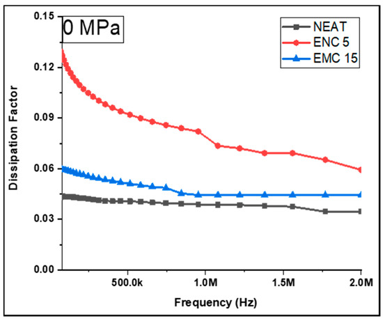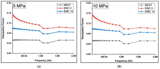 The dissipation factor was recorded against the ramped compression. Figure 8 and Table 3 are given to demonstrate the calculated average dissipation factors of all the samples at the selected frequency range against the corresponding compression pressure, while Figure 9 shows the trends of the dissipation factor against the frequency range. It can be observed that almost a similar pattern was followed by dielectric constant (ĸ). There was less change in DF in the neat epoxy after each compression step. At 5 MPa and 10 MPa, DF remained same, but at 15 MPa, 20 MPa, and 25 MPa, it was increased to 0.04 from 0.03 as compared to the uncompressed. In the case of ENC 5, DF increased to 0.25 from 0.18 at 10 MPa and remained almost the same up to 25 MPa. In comparison to the uncompressed sample, a 1.33-times increase was recorded. In the case of EMC 15, DF was most affected by increasing mechanical compression and increased 2.2 times from 0.04 to 0.11. This could be attributed to the inhomogeneities of micro-fillers. The dissipation factor (dielectric loss) was influenced by the enhancement of interfacial polarization due to the presence of mobile ionic impurities [27,28].