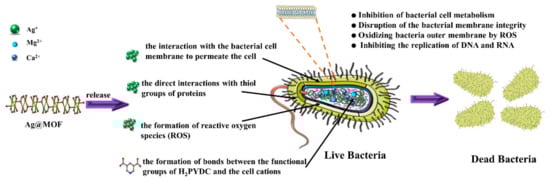 Ag@MOF [Ag5(PYDC)2(OH)] was synthesized under the modified hydrothermal according to our previous work [35]. Briefly, 0.14 g of H2PYDC was dispersed into 20 mL of deionized water to give the suspension and 0.32 g of AgNO3 was dissolved in suspension A to give suspension B. Suspension B was sonicated for 20 min and was sealed in a 50 mL Teflon-lined stainless steel autoclave and heated at 120 °C for 24 h. After cooling to room temperature, the colorless crystals were obtained through repeated centrifugation and redispersion with DI water (St. Louis, MO, USA). The Ag@MOF was dried at 80 °C for 12 h. The antibacterial mechanisms of Ag@MOF can be seen in Figure 1.