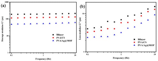Figure 4 exhibits typical gel rheological behaviour by the linear viscoelastic frequency scan response. The storage modulus (G’) of the hydrogels is much higher than the loss modulus (G″). PVA/Ag@MOF, bilayer, and PVA/CS show rheological properties in ascending order. This indicates that the hydrogels are highly elastic [37]. This suggests that the addition of Ag@MOF has a negative effect on the hydrogen bonding crosslinking of PVA and reduces the density of the polymer network. The rheological properties of the bilayer hydrogel, on the other hand, are much higher than those of commercial scaffold.