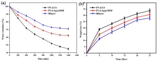 Figure 5a exhibits the results of water retention. PVA/CS, PVA/Ag@MOF, and bilayer showed water retention in ascending order. This may be due to the rigid hydrophobic structure of Ag@MOF and the layered structure of bilayer hydrogels [36]. The higher water retention of the hydrogels can prevent the hydrogels from dissolving or deforming and causing negative effects on the body. In addition, hydrogels has a porous spatial structure, which is conducive to gaseous exchange and provides a site for cell adhesion and proliferation.