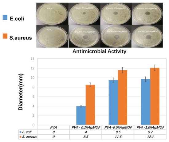 Tissue engineering scaffold should have good antibacterial activity to prevent a serious risk of infection [21]. The antimicrobial activity of composites hydrogel was tested against S. aureus and E. coli which represent Gram-positive and Gram-negative bacteria, respectively in Figure 6. The diameter of inhibition zone is related to the sensitivity of the hydrogels to microorganisms in the disk diffusion test. The PVA have hardly any antibacterial activity. PVA/Ag@MOF hydrogels exhibited excellent antibacterial activity on both Gram-negative and Gram-positive bacteria. PVA, PVA/0.1%Ag@MOF, PVA/0.5%Ag@MOF, and PVA/1.0%Ag@MOF show antimicrobial activity in ascending order. Due to its relatively large size, Ag@MOF cannot penetrate bacterial cell membranes. PVA/Ag@MOF can release Ag+ to strongly attract the enzyme protein in bacteria, and quickly bind together to destroy the bacterial cell membrane. Ag+ can also form reactive oxygen species (ROS) that further attack cell membranes [35]. In addition, Ag@MOF can cause the functional groups of organic ligand to form bonds with the cations of cells, further promoting bacterial death.