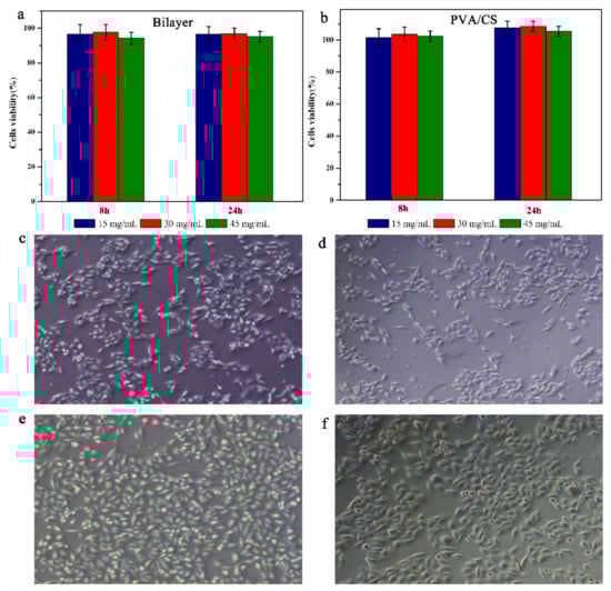 Viability of A549 cells treated with increasing concentrations of (a) PVA/CS and (b) bilayer hydrogels for 8, 16, and 24 h; Optical microscope images (100×) of (c,d) MDA-MB-231 cells and (e,f) A549 cells cultured on the surface of PVA/CS and bilayer hydrogels.