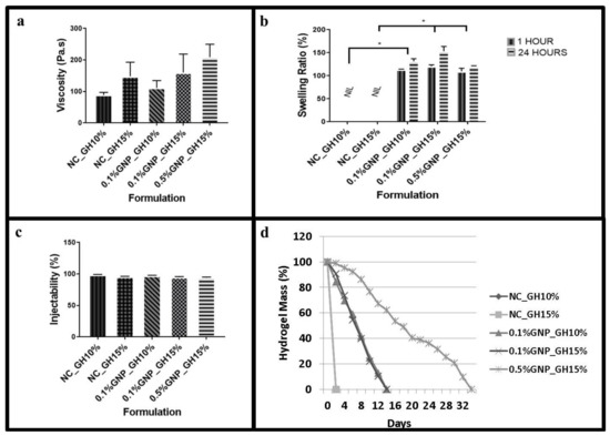Fluidity, swelling and biodegradation test. (a) Viscosity values of GNP_GH were slightly higher than NC_GH. GNP_GH groups were considered as injectable systems. (b) NC_GH groups were not stable in PBS solution. Meanwhile, GNP_GH groups exhibited a good swelling ratio (> 100%) after 1 day of PBS exposure. (c) GNP_GH groups revealed high injectability (>90%). (d) NC_GH groups were not stable in the enzyme environment and GNP_GH groups were resistant against collagenase degradation. * represented significant difference (p ˂ 0.05, n = 3, N = 3).