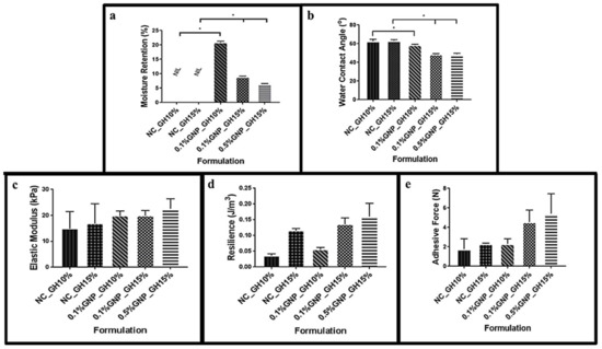 Figure 4a shown the significant difference in water retention for 0.1%GNP_GH10%, 0.1%GNP_GH15% and 0.5%GNP_GH15% compared to NC_GH control groups (p ˂ 0.05) after 2 days of incubation. It can be seen that 0.1%GNP_GH10% (20.9 ± 0.4%) demonstrated the highest retention compared to that of 0.1%GNP_GH15% (9.0 ± 0.20%) and 0.5%GNP_GH15% (6.5 ± 0.2%). The NC_GH were fully dissolved after 24 h. Moreover, all GNP_GH exhibited significantly lower wettability (p ˂ 0.05) than NC_GH control groups (Figure 4b). The contact angle revealed the highest value in 0.1%GNP_GH10% followed by 0.1%GNP_GH15% and 0.5%GNP_GH15% were 58.6 ± 0.6°, 48.7 ± 0.3° and 48.5 ± 0.2°, respectively. Besides, the GNP_GH shown higher value in elasticity (Figure 4c), resilience (Figure 4d) and adhesiveness (Figure 4e) than NC_GH control groups, however, there were no significant differences revealed. Finally, the 0.5%GNP_GH15% dominated the elasticitiy (22.6 ± 3.9 KPa), resilience (0.16 ± 0.04 J∙m−3) and adhesive within GNP_GH formulations.