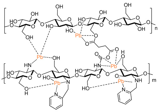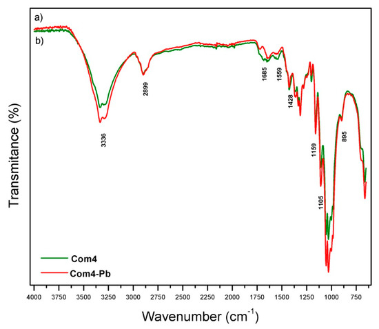 Figure 3 shows the FTIR comparison for the Com-4 composite before and after Pb(II) adsorption. A decrease in the intensity of several signals (1685, 1559, 1427, 1105, and 895 cm−1) due to adsorption of lead by the composite can be observed (see also Figures S1 and S2 in Supplementary Materials). This behavior was reported previously, and was attributed to an interaction between nitrogen atoms and lead ions. This suggests that Pb(II) adsorption in Com-4 is, at least, partially carried out by amino groups from chitosan [38,39,40]. Scheme 3 shows the composite with a possible coordination site for the lead atom, where nitrogen atoms and the carbonyl group form interactions with the metal. According to Pearson’s concept of hard and soft acids and bases, the composite could behave as a hard base due the presence of electron pairs in the nitrogen and oxygen atoms, which interact preferentially with metal ions, such as Pb(II), which is considered a borderline atom [41,42].