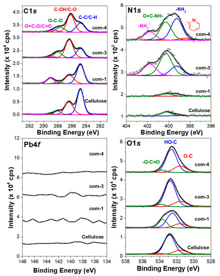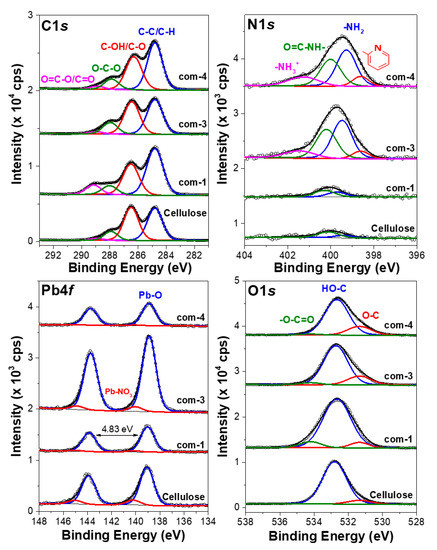 Figure 4 shows the high-resolution spectra corresponding to the C 1s, N 1s, Pb 4f, and O 1s core energetic levels of cellulose, Com-1, Com-3, and Com-4 derivatives. The C 1s spectra region includes four components. The first peak located at 284.8 eV was attributed to C–H/C–C chemical bonds; the C–NH2 bond can be overlapped by this peak. The second peak is centered at 286.4 eV, which was assigned to C–OH, C–O, and C–N bonds. The third peak found at 287.9 eV corresponded to O–C–O/N–C=O bonds. Finally, the peak at 289.0 eV was associated with the C=O or O=C–O bonds [43,44,45,46].