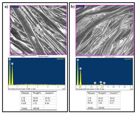 SEM images and EDS spectra for (a) cellulose and (b) Com-1.