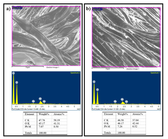 Scanning electron microscopy images and energy-dispersive x-ray spectra from cellulose and cellulose derivatives after Pb(II) adsorption are shown in Figure 6 and Figure 7. We acquired each EDS spectrum at the 150 μm region. Pb signals in the cellulose were absent, which was likely related to the small amount of Pb(II) adsorbed, as shown in kinetic adsorption (see the next section). Pb(II) signals were mostly evident for all cellulose derivatives; for these scanned regions, Pb(II) content was higher for cellulose-chitosan derivatives (Com-1 and Com-3).