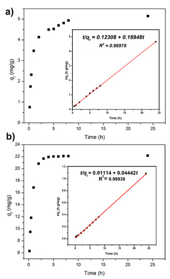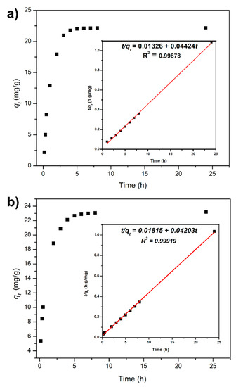 Adsorption kinetics of (a) cellulose treated with chitosan (Com-3), and (b) cellulose treated with chitosan pyridine (Com-4). Inserts show the experimental data fitted to a pseudo-second-order kinetic model.