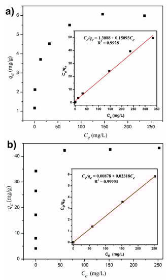 where qe (mg/g) is the amount of Pb(II) adsorbed onto the cellulose derivative at equilibrium; qm (mg/g) is the saturated adsorption capacity of Pb(II) adsorbed onto the cellulose derivative to form a complete monolayer coverage; KL (L/mg) is the Langmuir adsorption coefficient; KF is the Freundlich adsorption coefficient related to the adsorption capacity; n is an indicator of isotherm nonlinearity corresponding to the adsorption intensity at specific temperatures [36]. Each graph corresponds to the averege of three independent experiments, and the Pb(II) concentration measurement in each experiment was performed in triplicate.
