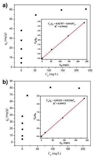Adsorption isotherms describe the relationship between adsorbents and adsorbates when equilibrium is attained. The adsorption isotherms of Pb(II) on cellulose derivatives were obtained by adding 0.5 g of cellulose, Com-1, Com-3, or Com-4 into 100 mL of heavy metal ion solution, with concentrations ranging from 12.5 to 400 mg·L−1. All adsorption isotherm experiments were realized at a pH of 5. Dispersions were shaken mechanically at 150 rpm in room temperature, and 1 mL of the solution was extracted after 24 h. The Pb(II) concentration was measured with an Agilent MP-AES 4200 microwave plasma-atomic emission spectrometer (Santa Clara, CA, USA) using a wavelength of 405.78 nm, and a nebulizer pressure of 0.95 L/min. Experimental data were fitted using Langmuir and Freundlich isotherm models:
