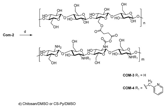 To continue the cellulose functionalization, we cross-linked Com-2 with chitosan or Cs-Py using DMSO as solvent at reflux temperature generating the derivatives Com-3 and Com-4, respec-tively (Scheme 2).