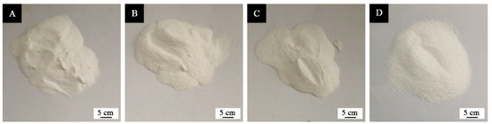 The macroscopic images of microcapsule powder: (A) sample 1#, (B) sample 2#, (C) sample 3#, (D) sample 4#.