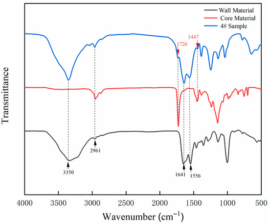 The FTIR spectrogram of wall material, core material, and sample 4# microcapsule.