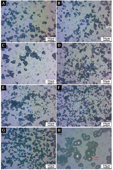 The OM appearance of microcapsules by single factor experiment: mass ratio of core to shell (A) 0.42:1, (B) 0.50:1, (C) 0.58:1, (D) 0.67:1, (E) 0.75:1, (F) 0.83:1, (G) 0.92:1, (H) 0.67:1.