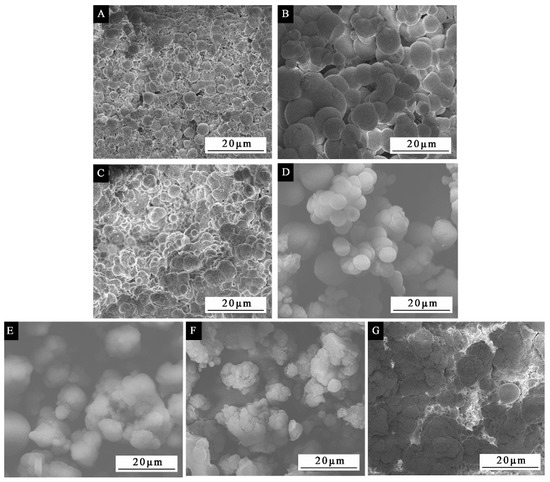 The SEM appearance of microcapsules by single factor experiment: mass ratio of core to shell (A) 0.42:1, (B) 0.50:1, (C) 0.58:1, (D) 0.67:1, (E) 0.75:1, (F) 0.83:1, (G) 0.92:1.