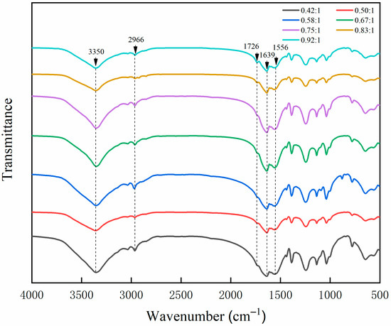 Figure 7 shows the FTIR of seven kinds of microcapsules prepared by single factor experiment. The special absorption peaks of N-H and C-N functional groups are at 3350 and 1556 cm−1. The absorption at 1639 cm−1 is the stretching vibration of C=O functional group in UF resin. The absorption at 2966 cm−1 is the special absorption peak of C-H functional group, and the peak at 1726 cm−1 represents the special absorption of C=O functional group in waterborne acrylic acid coatings. It can be found from the picture that the special absorption peaks of microcapsules by different ratios of core to wall are similar, which can prove that the chemical component part of microcapsules by different ratios of core to wall is still present, and the microcapsules are successfully prepared.