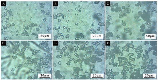 OM morphologies of microcapsules prepared under different depositing time: (A) 0, (B) 1 d, (C) 2 d, (D) 3 d, (E) 4 d, (F) 5 d.