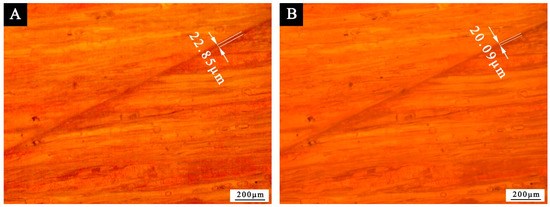 According to the relevant literature, when the mass fraction of epoxy resin microcapsule, shellac microcapsule, and waterborne acrylic acid microcapsule in waterborne coating is 10.0%, the coating performance is better [32,33,34]. Therefore, in order to carry out the subsequent comparative analysis, the optimized mass ratio of core to shell of 0.67:1 waterborne coating microcapsules were added to the waterborne coating with a mass fraction of 0 and 10.0%, respectively, and stirred evenly. The prepared coating was applied on Tilia europaea substrate to form a uniform coating on its surface. After the coating was completely dry, 800 mesh sandpaper [36] was used to grind the paint coating to make it smooth and the surface was mopped up with dry cloth. The above procedure was performed three times in the same way to obtain a coating thickness of about 60 μm.
