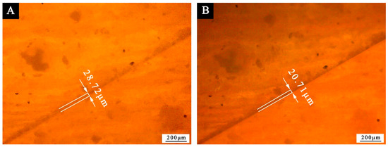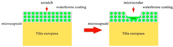 In terms of self-healing performance, the blade was used to mark the cracks on the paint coating on the surface of Tilia europaea, and the OM was used to record the cracks. After an interval of 5 d, the OM was used to observe the self-healing effect of the paint coating again. According to Figure 10, the scratch width of the coating without microcapsules changed from 22.85 to 20.09 μm, and there was no obvious change. However, it can be seen from Figure 11 that the scratch width of the coating with 10.0% microcapsules decreased significantly from 28.72 to 20.71 μm after 5 d. It can be seen that the self-healing effect of the coating with microcapsule is better than that without microcapsule. Therefore, 10.0% microcapsules have a certain self-repairing effect on the micro cracks on the surface coating of wood. The self-healing mechanism of Tilia europaea surface coating containing microcapsules is shown in Figure 12. When the coating cracks, the microcapsules in the coating will break, and the waterborne coating core repair agent in the microcapsules will flow out. The waterborne paint repair agent can be cured into a film at room temperature. The curing of waterborne coating mainly has three levels of mechanisms. The first is the volatilization of water and other film-forming aids to fully reflect the basic properties of the thermoplastic resin itself, the second is the aggregation and fusion of the emulsion particles, and the third is mutual diffusion of particles. When the temperature is higher than the glass transition temperature, the final film is formed. The micro-cracks on the coating surface can achieve a certain self-repairing effect through the curing of the core material repairing agent.