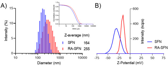 Figure 1A shows the intensity size distribution of SFNs and RA-SFNs. The raw correlograms from which the size distribution by intensity and Z-average were calculated can be seen in the insert of Figure 1A. As can be seen from the distribution (Figure 1A), both systems present a narrow monomodal distribution with a polydispersity index (PdI) of 0.110 and 0.187 for SFNs and RA-SFNs, respectively. The Z-average and diffusion coefficient values for SFNs were 164 nm and 2.99 µ2/s respectively, while the RA-SFNs presented values of 255 nm and 1.93 µ2/s, respectively for the same parameters. As regards Z-potential and electrophoretic mobility, SFNs showed a value of −30 mV and −2.408 µmcm/Vs, respectively, while the RA-SFNs presented values of −17 mV and −1.333 µmcm/Vs. Z-potential distribution for the two systems is shown in Figure 1B.