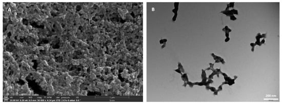 The size and morphology of RA-SFNs were investigated by FESEM and TEM (representative pictures of the system are presented in Figure 2A,B, respectively). It can be seen that the nanoparticles present a granular, quasispheroidal morphology of around 100 nm. When comparing the size observed by microscopy with the Z-average measured by DLS, several things need to be considered. Firstly, in the latter method, size is derived from diffusivity and is given as an intensity weight distribution, while in the former, size is obtained by a number distribution. Secondly, in the case of DLS, particles are dispersed in water whereas they are measured while in FESEM, the particles are dried. Therefore, in DLS a swelling effect due to the protein interaction with water must be borne in mind, as previously described [24,42]. Finally, it is worth noting that DLS size includes the diffusion layer around the particle [43]. Bearing in mind these considerations, the size of RA-SFNs measured by both techniques were in line.
