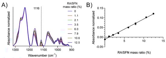 The first step for drug quantification, according to the method developed by Carissimi et al. [30], is to identify a signal from the drug in question which shows low-to-no interference with the polymeric matrix of the nanoparticles. From the baseline corrected and normalized ATR-FTIR spectra of RA, SFNs and RA-SFNs (Figure 3), it can be observed that SFNs (blue line) present no signal in the 1137 to 1095 cm−1 region, while RA (green line) presents a sharp peak at 1116 cm−1. This signal can be also identified in the RA-SFNs (red line) spectrum. It is important to note that no shift is observed. The peak from the amide III band of the SF protein is then used for normalization purposes. A calibration curve was constructed from calibration samples with a constant SFN mass and increasing RA mass. The calibration spectra and calibration curves obtained are presented in Figure 4. From the figure, it can be observed that there is a good linear correlation between the normalized absorbance and the concentration of RA in the sample, with an R2 of 0.9968 (as shown in Table 1 along with the curve fitting parameters).