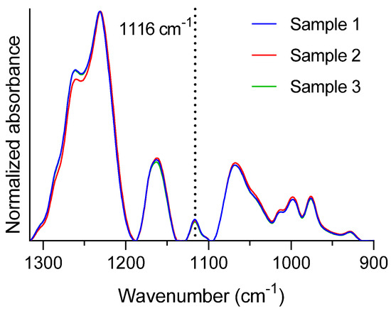After the loading phase, three independent samples were measured in ATR-FTIR to determine their DLC. Sample spectra are shown in Figure 5. The baseline was corrected, and the spectra were normalized to an absorbance of 1 at 1228 cm−1, while the absorbance at 1116 cm−1 was interpolated in the calibration curve (Figure 4B). The average DLC obtained was 9.4 ± 0.5% of RA, yielding an EE of 39 %.