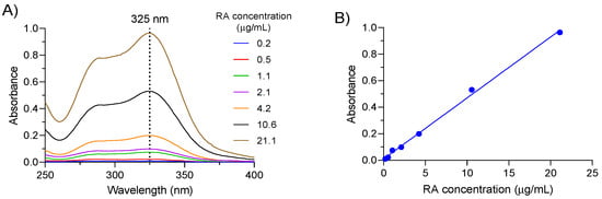 (A) UV-vis spectra of calibration samples in PBS. (B) Calibration line for RA in PBS. Error bars are not visible due to the low SD.