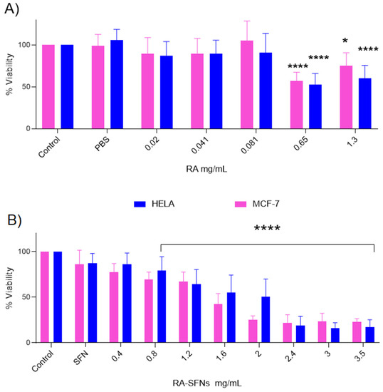 The cytotoxic effect of free RA and RA-SFNs on the viability of HeLa and MCF-7 cells was evaluated. The cell lines in question were selected according to their origin and features: HeLa cells are derived from cervical carcinoma and MCF-7 are breast carcinoma cells. Both cell lines are of human origin and have been widely used in cytotoxicity studies. The cells were exposed to different concentrations of RA (0.02–1.3 mg/mL) and RA-SFNs (0.4–3.5 mg/mL) for 48 h, and cell viability was measured by MTT assay. As stated above, the concentration range of free RA was in accordance with the DLC of the RA-SFNs in order to establish a suitable comparison. Figure 8 shows the cell viability as a function of free RA (Figure 8A) or RA-SFN (Figure 8B) concentration. The results show that the cytotoxicity of free RA was much lower against both cell lines than that of RA-SFNs in the same drug concentration range. Indeed, cell viability only decreased to any great extent when a high concentration of free RA was used, (0.65 and 1.3 mg/mL, drug concentrations much higher than that found for the maximum RA-SFN concentration of 3.5 mg/mL, which contained approximately 0.33 mg/mL of RA). However, in the case of RA-SFNs, cell death increased in a concentration-dependent manner: the higher the RA-SFN concentration, the lower the cell viability. The cytotoxicity of unloaded SFNs at the highest concentration of RA-SFNs (3.5 mg/mL) showed no significant differences from the control values.