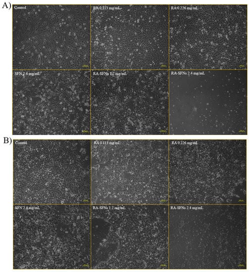 In order to corroborate the results obtained with the MTT assay, the morphology of HeLa (Figure 9A) and MCF-7 (Figure 9B) cells treated with RA 0.113 mg/mL, RA 0.226 mg/mL, SFNs 2.4 mg/mL, RA-SFNs 1.2 mg/mL and RA-SFNs 2.4 mg/mL was observed by confocal microscopy.