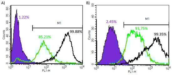 To test the potential of RA-SFNs as possible carriers of RA, we quantified the cellular uptake by determining the median intensity of the fluorescence (FITC) signal in the populations of HeLa and MCF-7 studied using flow cytometry. After culture exposed to 2.4 mg/mL of both FITC-labelled SFNs and FITC-labelled RA-SFNs, median cell fluorescence intensity values increased relative to controls, suggesting that both types of FITC-labelled nanoparticles have been successfully internalized by cells as can be observed in Figure 10. The results showed that the florescence intensity was smaller when cells were exposed to nanoparticles without drug than to FITC-labelled RA-SFNs moving the maximum from 85.21% to 99.88%, respectively, in HeLa cells and from 93.75% to 99.35%, respectively, in MCF-7 cells. These findings confirmed the internalization of both FITC-labelled nanoparticles into HeLa and MCF-7 cell lines, not showing significant differences on the uptake of RA-SFNs in the two cell lines studied. This fact suggests that the cellular uptake and cytotoxicity of the carriers were increased after being grafted with RA.